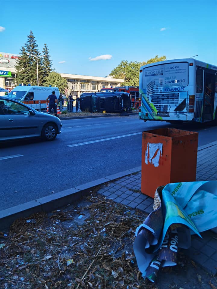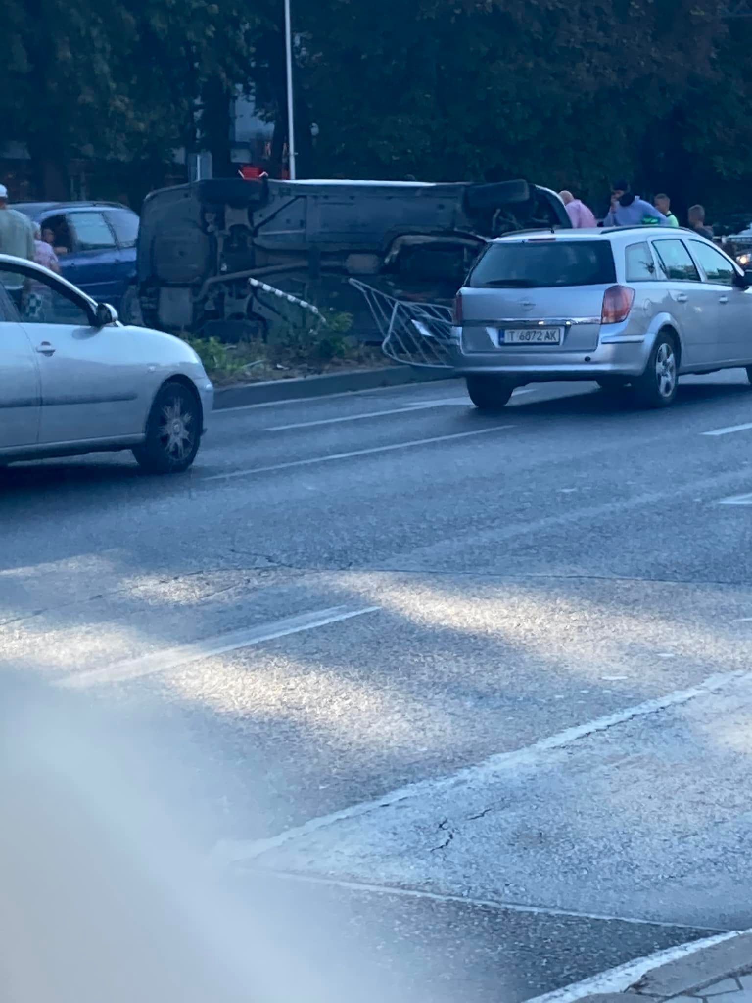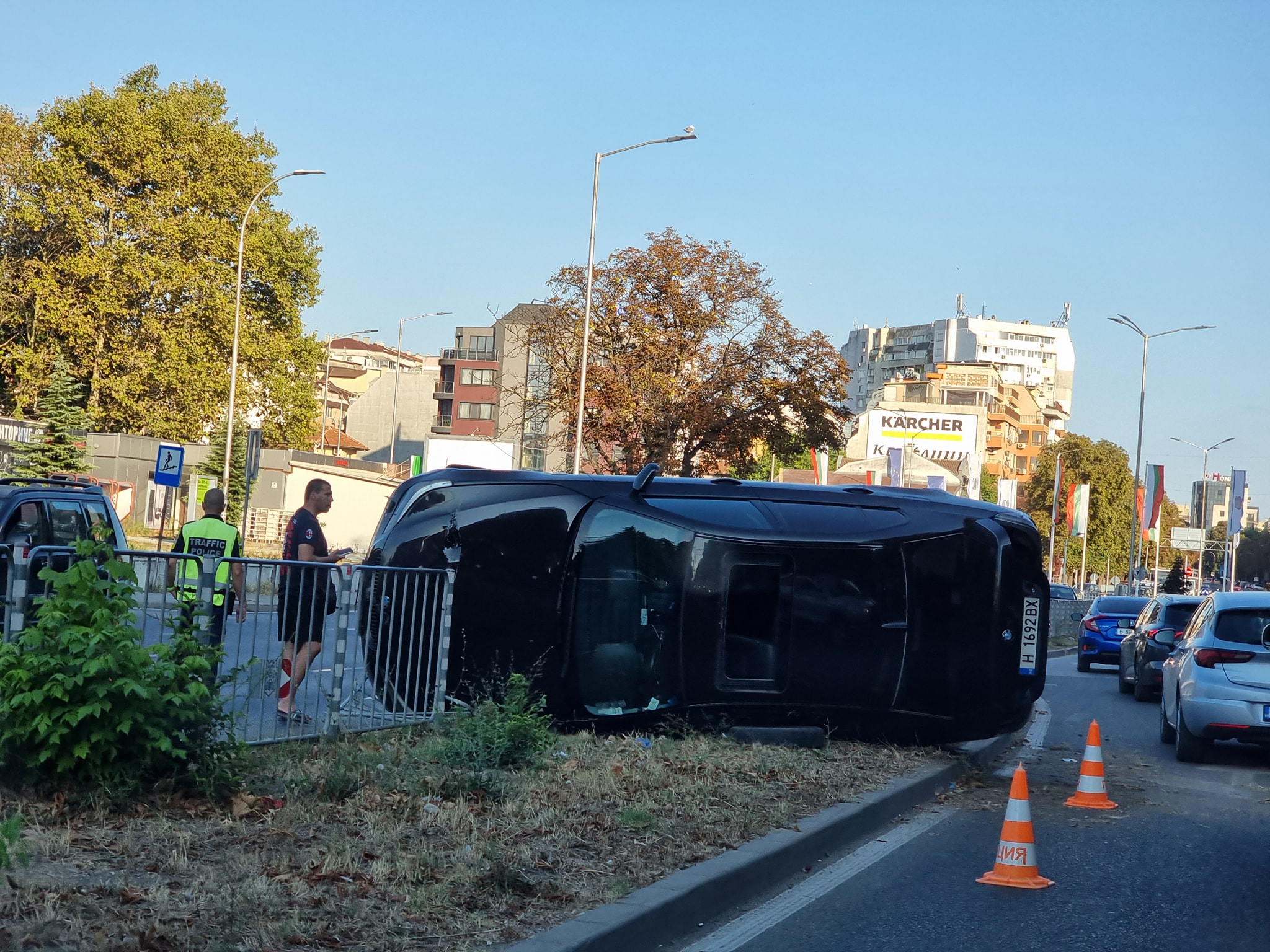 Автомобилът е " легнал " на едната си страна. За момента няма информация какво е положението на лидера.