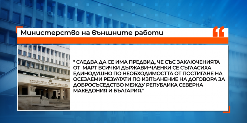 В отговор до Българска национална телевизия от Министерство на външните работи акцентират, че Съветът е показал какъв брой значимо е Скопие да реализира действителен прогрес по Договора за другарство и добросъседство с България.