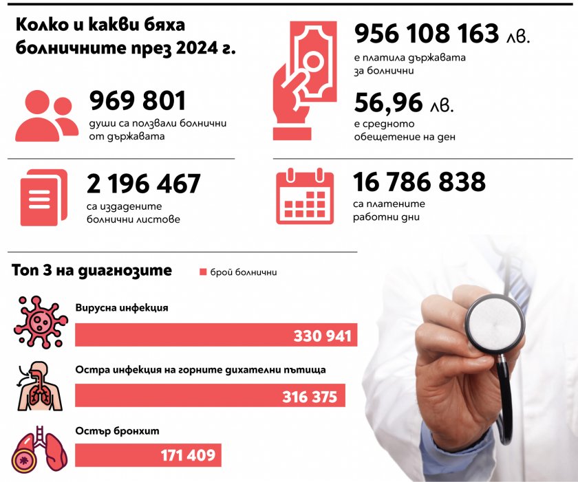 На този декор пораства “цената ” на болничните. През предходната година Национален осигурителен институт е платил с над 233 млн. лева повече за болнични и техният размер общо е стигнал рекордните 956 млн. лева