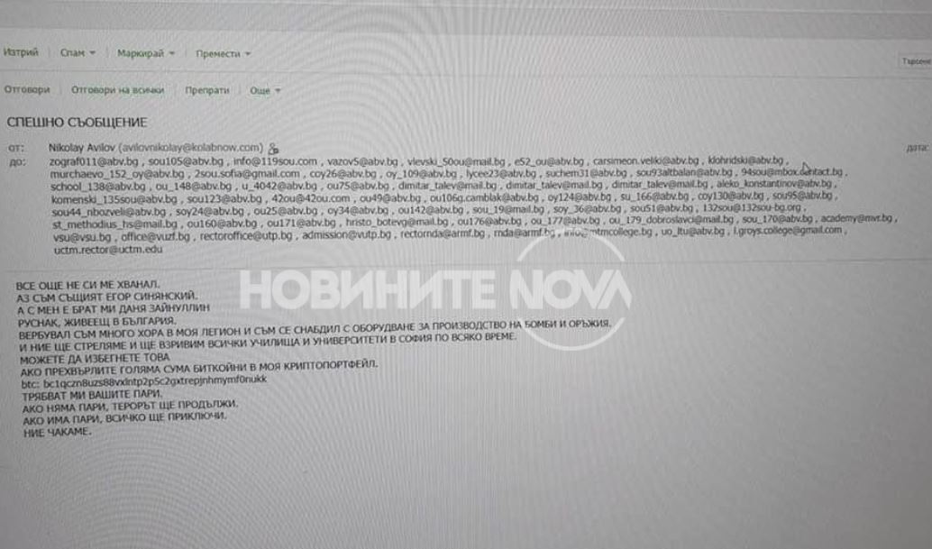 В известието, изпратено да учебните заведения, написа следното " Вербувал съм доста хора в моя легион и съм се снабдил с съоръжение за произвеждане на бомби и оръжия. Ще стреляме и взривим всички учебни заведения и университети в София. Може да избегнете това, в случай че прехвърлите огромна сума биткойни в моя криптопортфейла ".