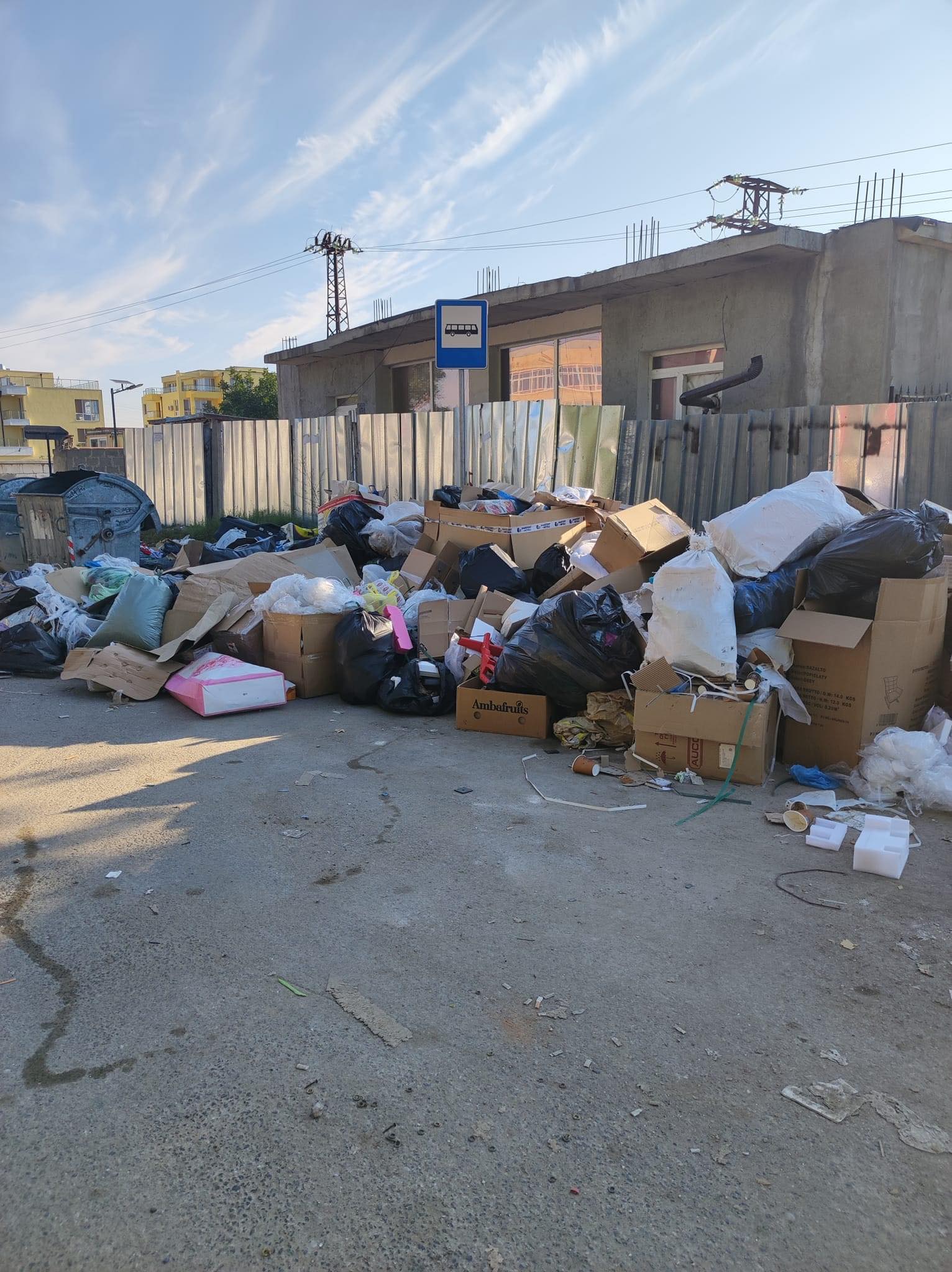 От фотосите се вижда по какъв начин контейнерите са изпразнени, а насъбраното количество отпадъци не е почиствано. Навсякъде към мястото, което е и спирка на градския превоз, са насъбрани картонени кашони, чували, цялостни с още отпадъци, и авточасти.