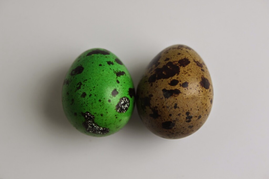 Яйце от пъдпъдък - лявото е боядисано с багра, дясното - с коприва.