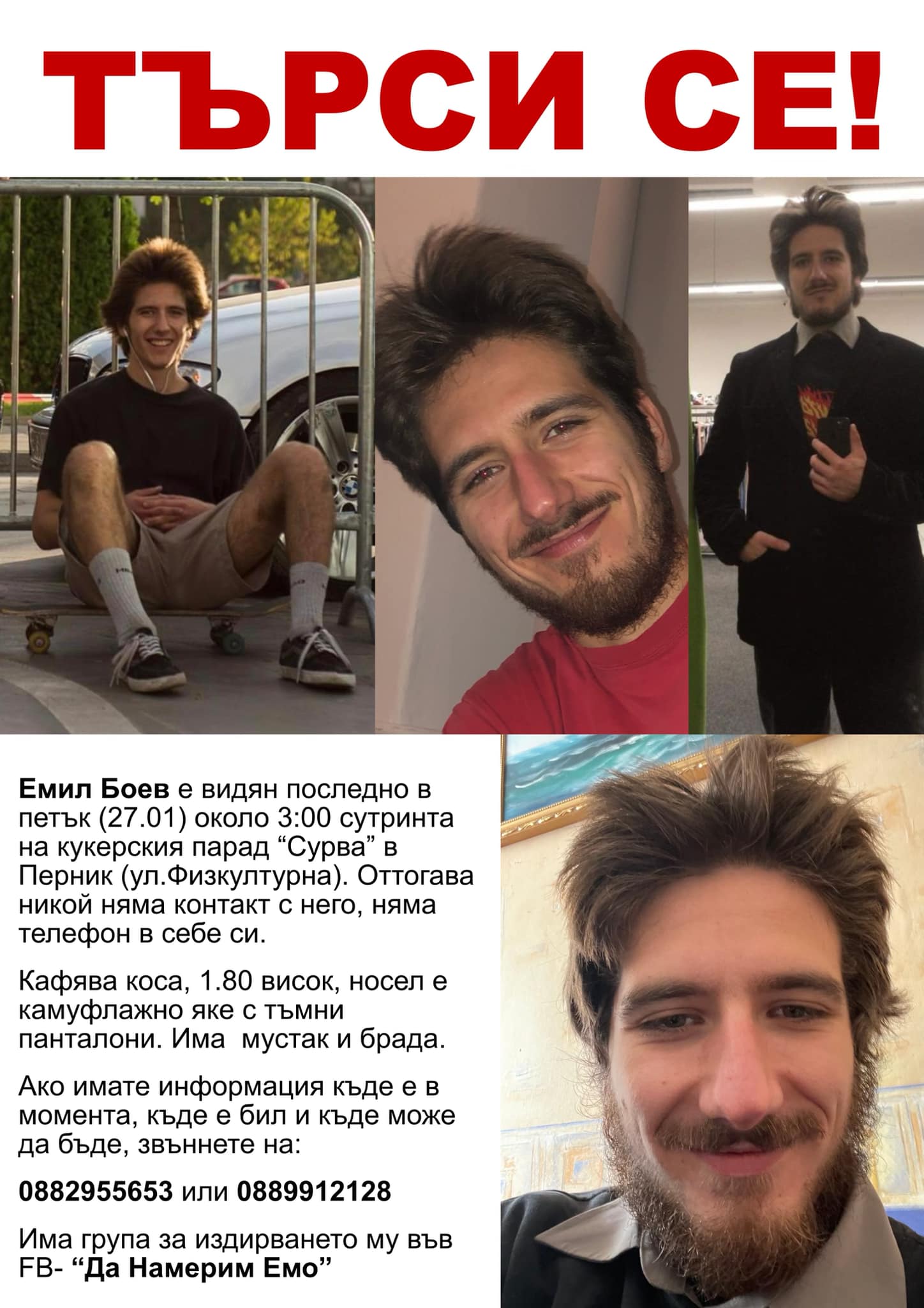Емил Боев бе разгласен за общодържавно търсене. Мъжът е висок към 180 см, с кестенява коса, брада и мустаци. В деня на изгубването си той е бил облечен с камуфлажно яке и мрачен панталон. Столичанинът е пристигнал в Перник в петък поради Международния фестивал " Сурва ". След това следите му се губят.