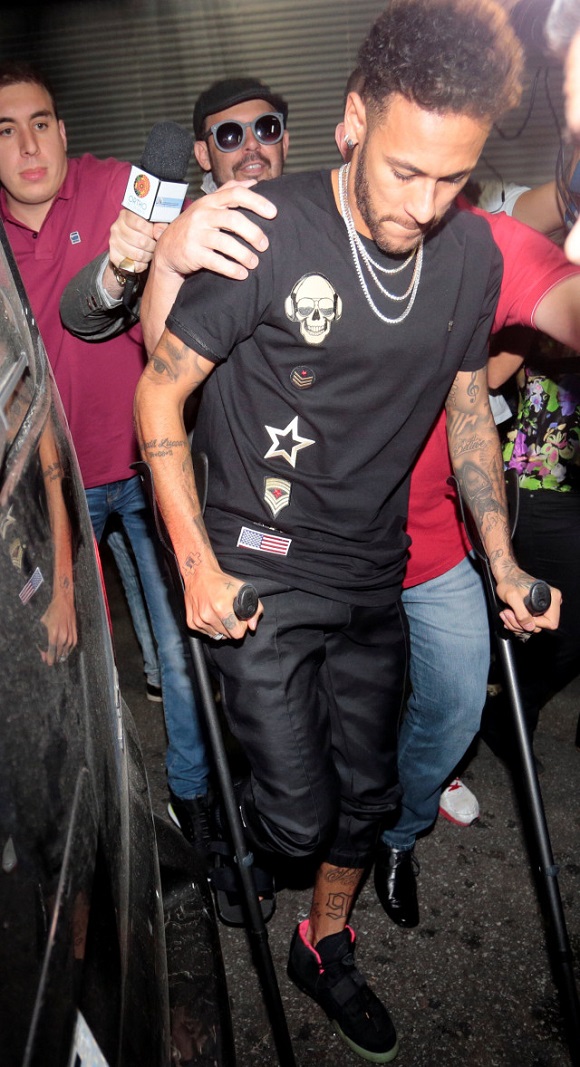 Освен, че потанцува у дома, Неймар се развихри и в нощен клуб в Сао Пауло. Подкрепян от патерици, той посети рождения ден на сестрата на своята половинка - Бруна. Той не отхвърли фотоси и подписи на почитателите пред клуба, двамата с красивата му другарка блестяха в стилни черни тоалети.