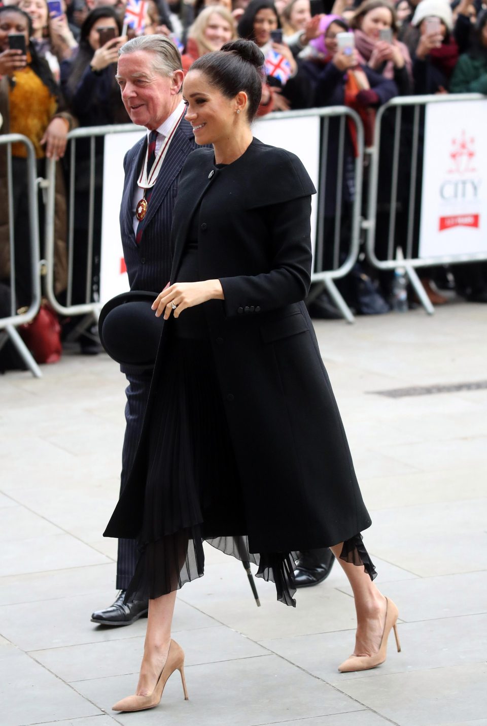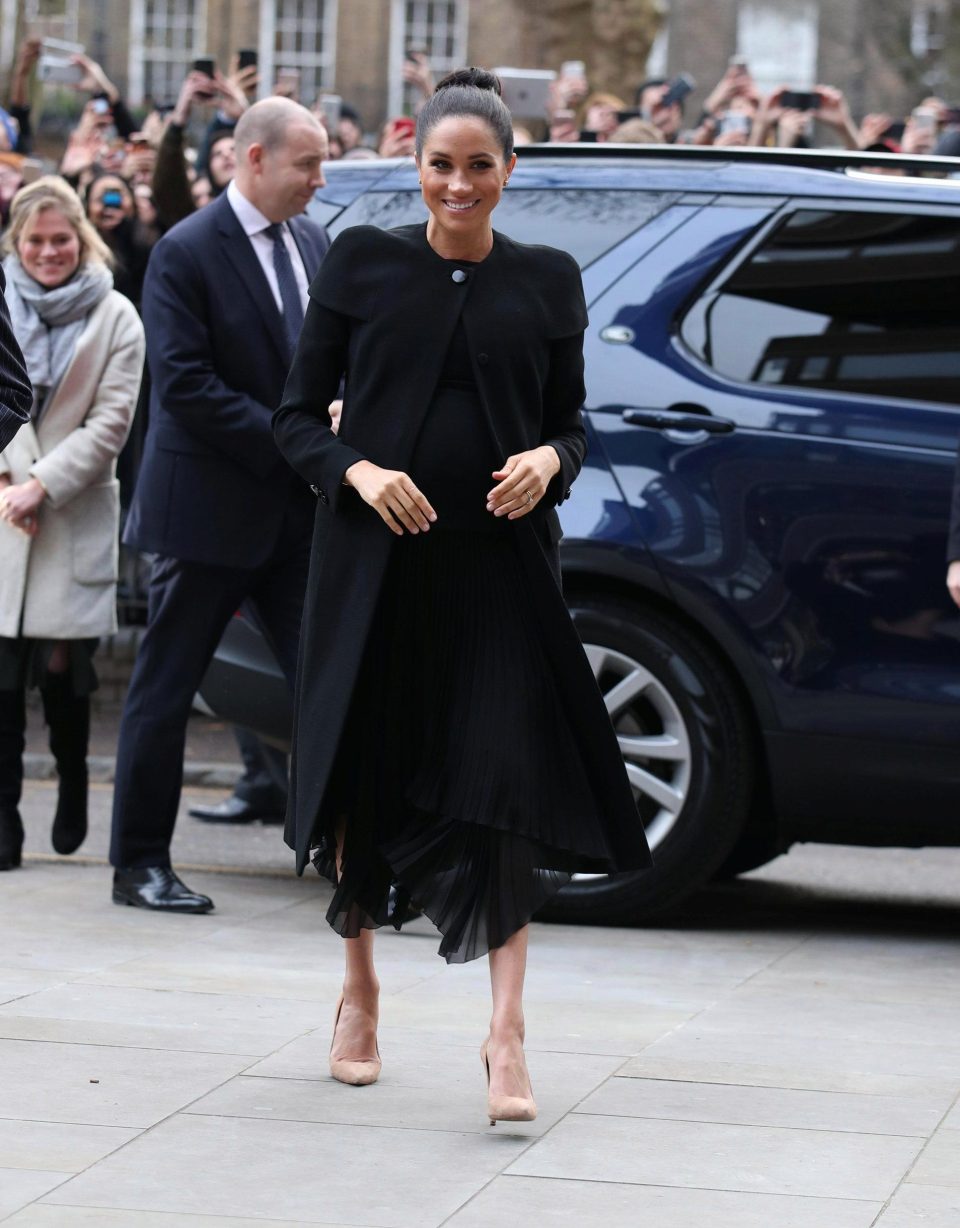 Херцогинята на Съсекс си разреши да носи черни облекла, прескачайки всички кралски обичаи, написа блиц. Тя дойде с черна рокля и палто в Лондонския университет по време на аудиенция.