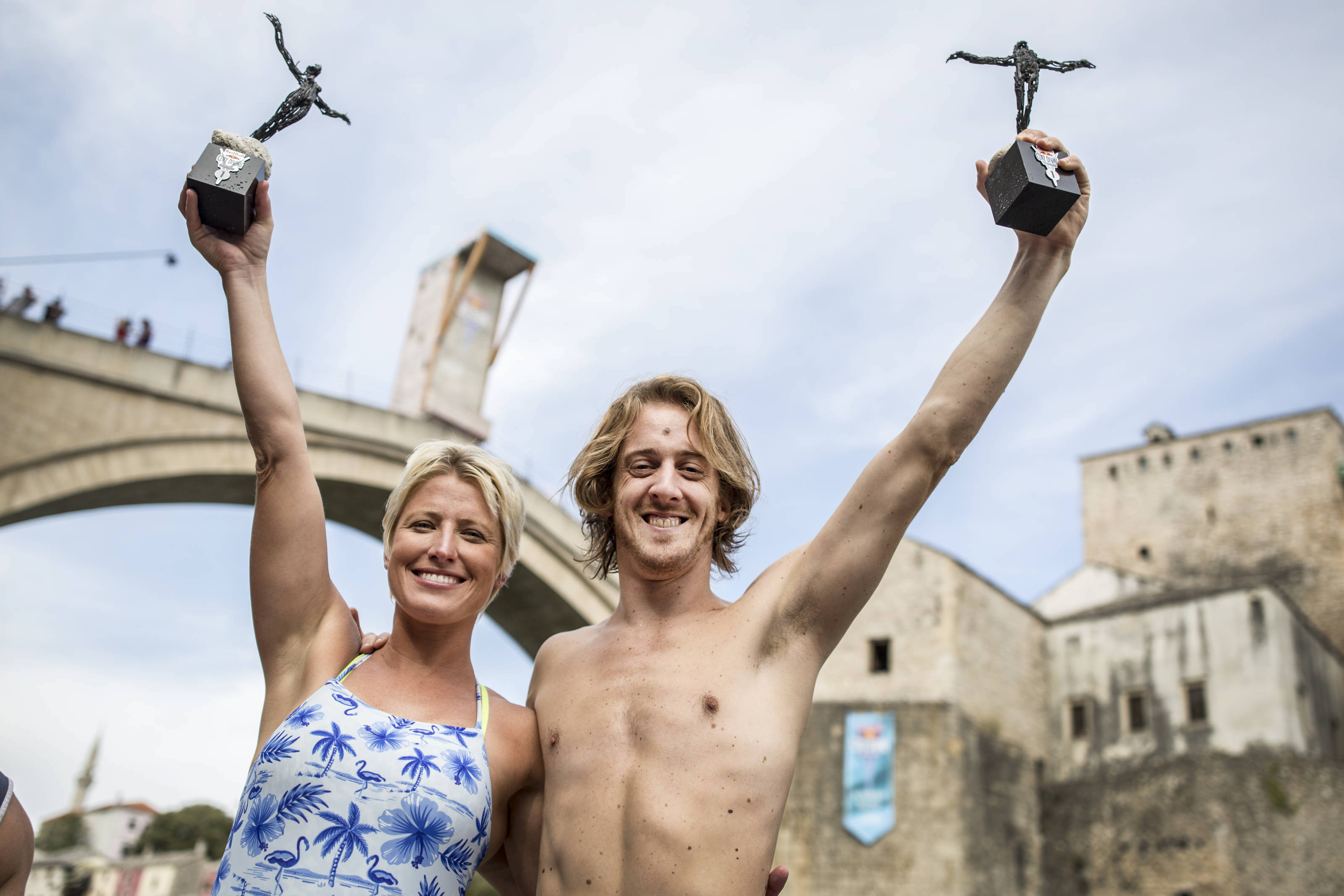 (Cesilie Carlton of the USA and Gary Hunt of the UK celebrate their wins next to Stari Most during the fifth stop of the Red Bull Cliff Diving World Series at Mostar, Bosnia and Herzegovina on September 16, 2017)