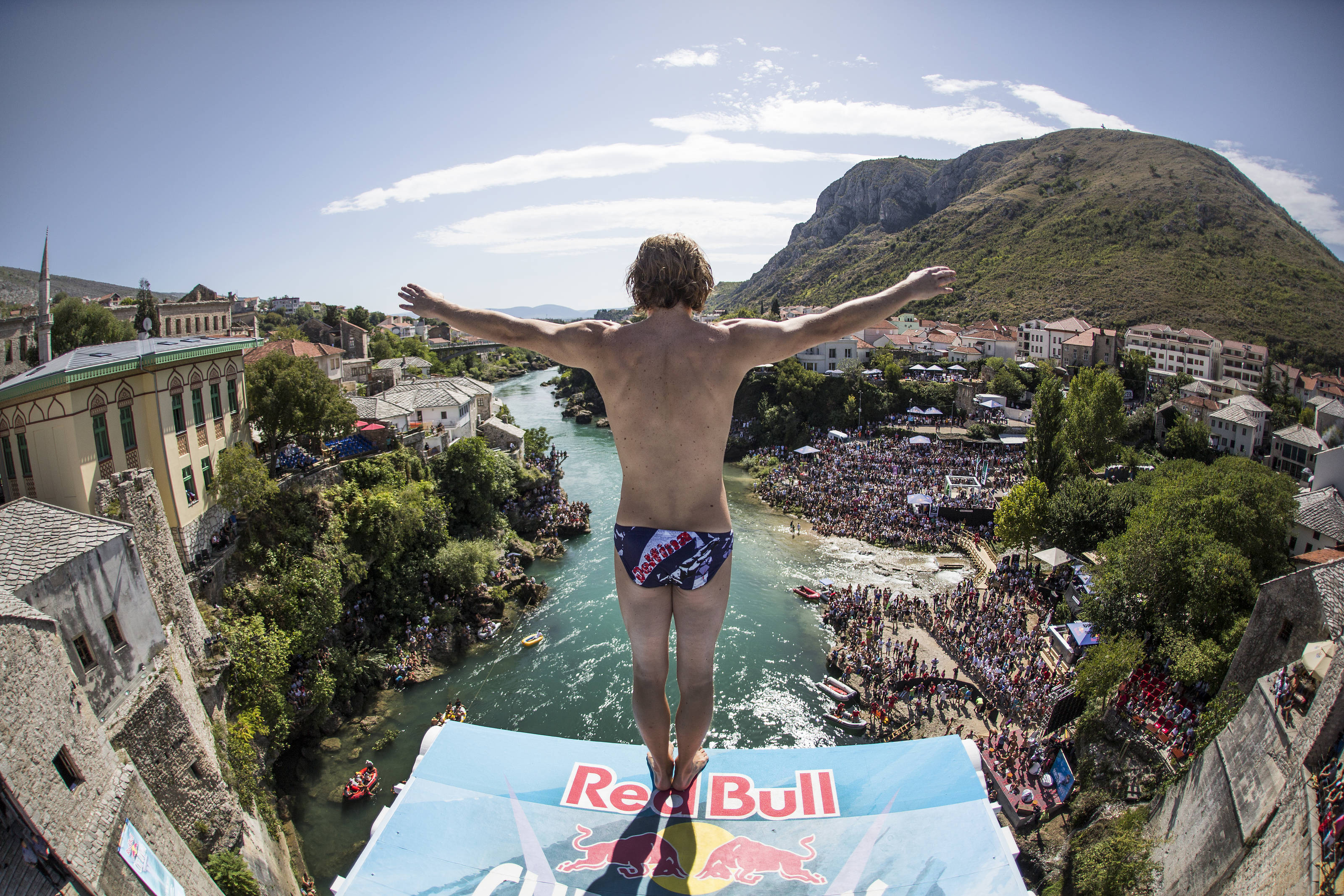 Британецът надделя проклятието на моста, а американката Карлтън постави завършек на плаващите си резултати с победа в предпоследната спирка от международните серии Red Bull Cliff Diving в Босна и Херцеговина.