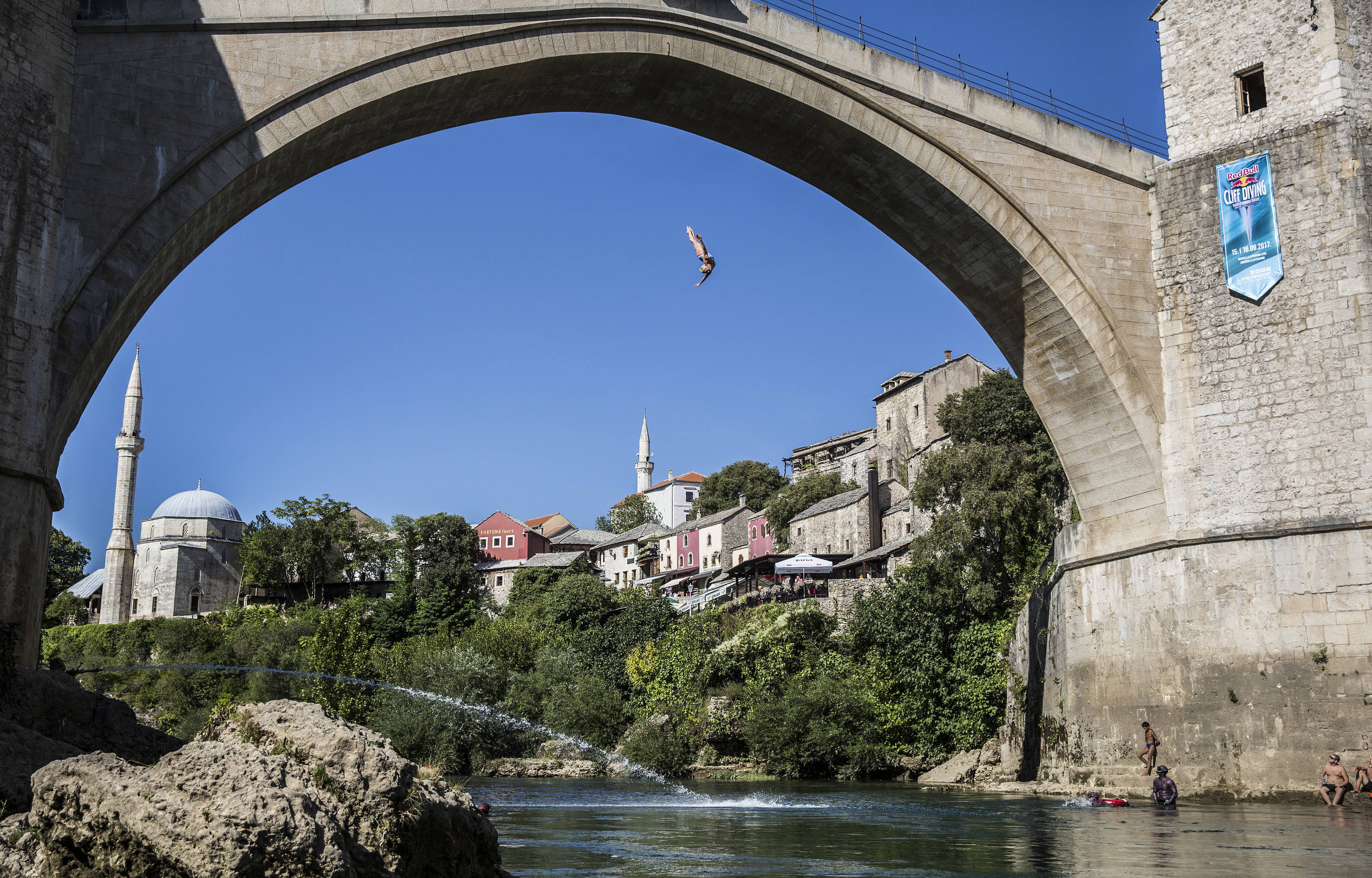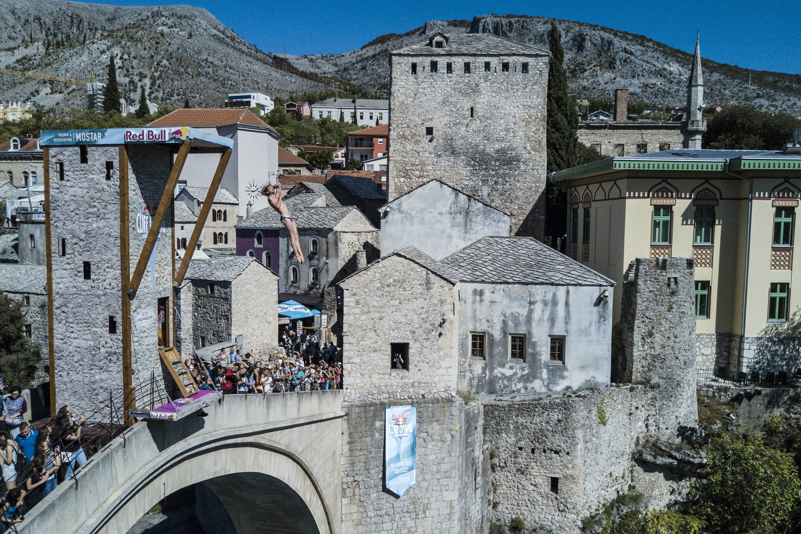 (Gary Hunt of the UK dives from the 27 metre platform on Stari Most during the fifth stop of the Red Bull Cliff Diving World Series at Mostar, Bosnia and Herzegovina on September 16, 2017)
