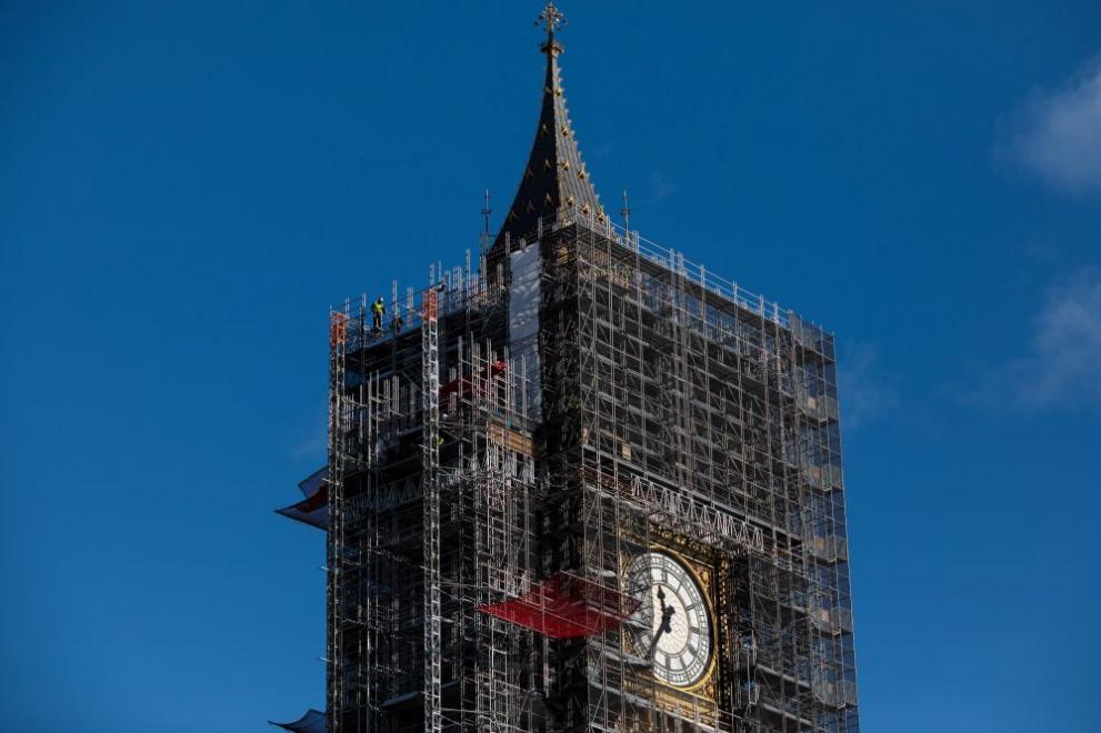 Заради реставрацията 96-метровата кула, която към този момент се назовава " Елизабет ", е заобиколена със скеле. Специалисти обновяват четирите часовника, боядисват металните елементи и почистват камъните.