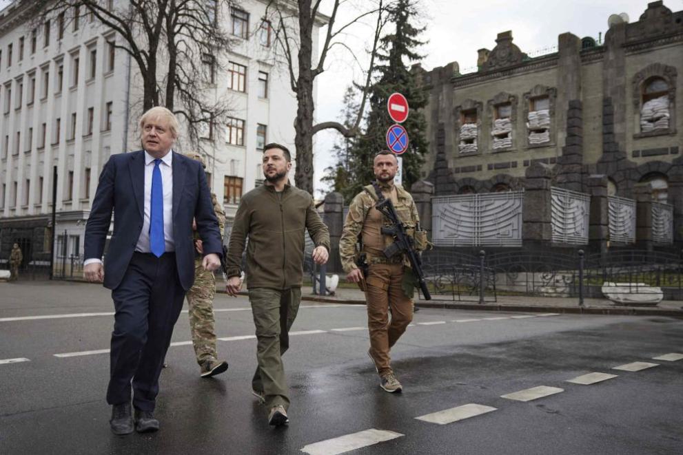 Британският министър председател Борис Джонсън, който е на изненадваща аудиенция в Украйна, и украинският президент Володимир Зеленски се разходиха дружно по улиците на Киев, където доста квартали бяха бомбардирани от Русия, заяви пресслужбата на президентството, представена от Франс прес.