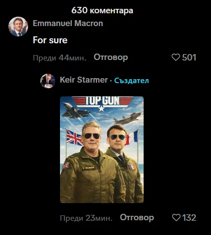 Отговорът на френския президент не закъсня. Макрон препубликува в обществените мрежи колажа на английския водач, на който дружно театралничат тъкмо като летците от филмовата класика, съпроводен с репликата: For sure.