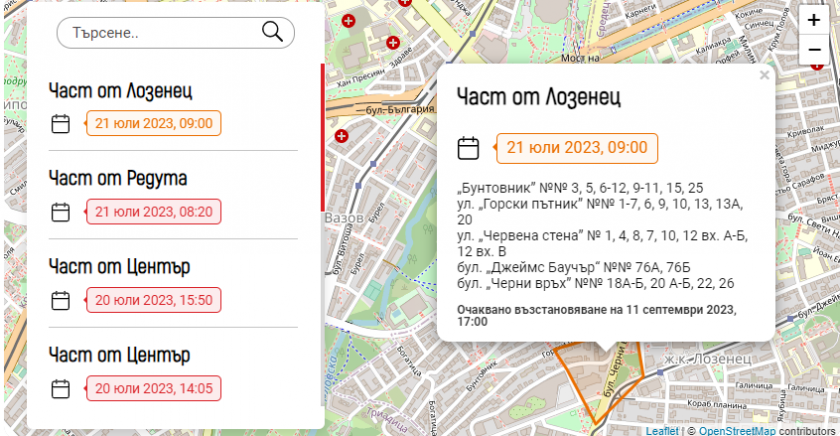 Според уеб страницата на сдружението няма да могат да си вземат обикновено душ на следните улици: