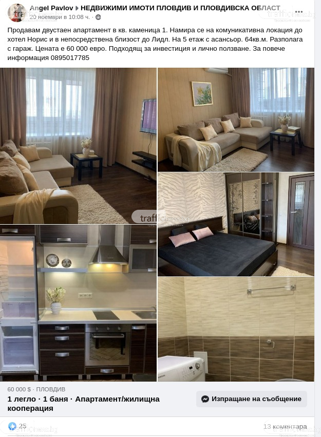 Публикациите, направена от подправен профил с име Ангел Павлов и на които отговаряше Теодор, са десетки. Общото посред им остава лъжливо ниската стойност, която не дава отговор на действителната пазарната стойност на жилището. Всички те не могат да бъдат открити в формалния уебсайт на брокерската организация. Ето и част от тях: