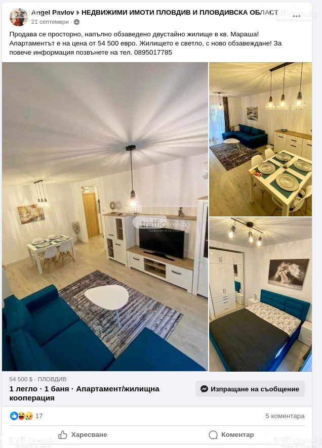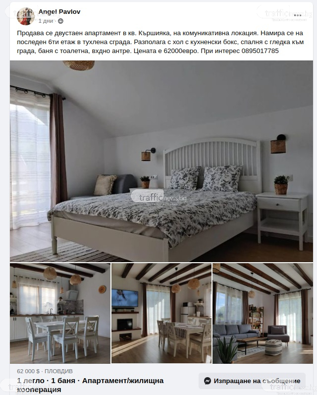 TrafficNews се натъкна на серия от примамливи разгласи в обществената мрежа Facebook, оповестени в групи за наемане и закупуване на парцели. Голямо усещане прави двустаен апартамент на региона на Новотел . На финален 6-ти етаж в тухлена постройка, който разполага с хол с кухненски бокс, спалня с панорама, баня с тоалетна и входно предверие. Цената за всичко това - 62 000евро .
