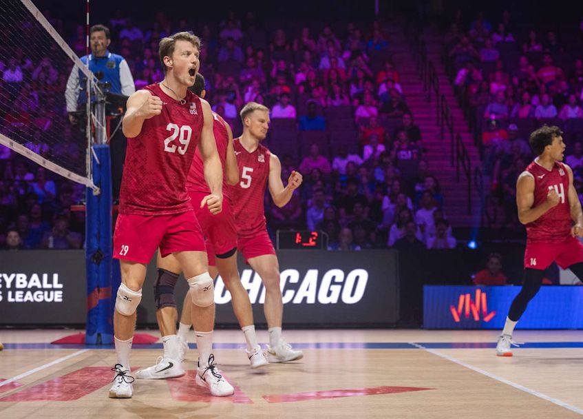 Бронзовият медалист от Париж 2024 Съединени американски щати записа доста сложна 3-а победа от началото на тазгодишната Волейболна Лига на нациите. Воденият от легендата Карч Кирали направи изстрадал поврат против Китай и надви с 3:2 (25:22, 21:25, 19:25, 25:16, 15:11) в първата си среща от шампионата в Група 5 от втората седмица, на който е хазаин, играна през миналата нощ пред близо 2500 фенове в зала " Нау Арена " в Чикаго (САЩ).