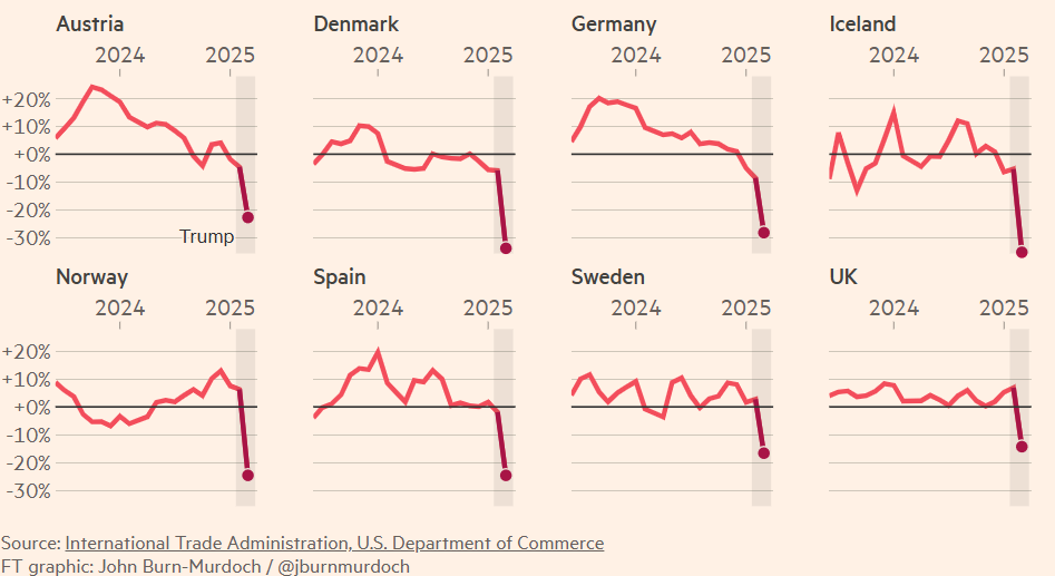 Посетителите от Западна Европа, които имат най-малко една нощувка в Съединени американски щати, са намалели със 17% през март по отношение на година по-рано, демонстрират данни на Международната комерсиална администрация ITA. Пътуванията от някои страни като Ирландия, Норвегия и Германия са намалели с повече от 20%.