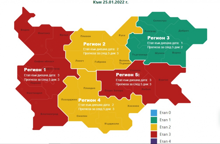 В тази връзка в Единния информативен портал към този момент се показват данни за заетостта на интензивните кревати в петте клъстъра. Към днешна дата има внезапна обстановка в картината. Регион 1 (Западна България) и Регион 5 (Бургас, Стара Загора, Сливен и Ямбол) са към този момент на Етап 3, а Регион 3 (Варна, Добрич, Силистра, Разград, Търговище и Шумен) остава в първи стадий съгласно националната подредба. Останалите два района са на Етап 2.