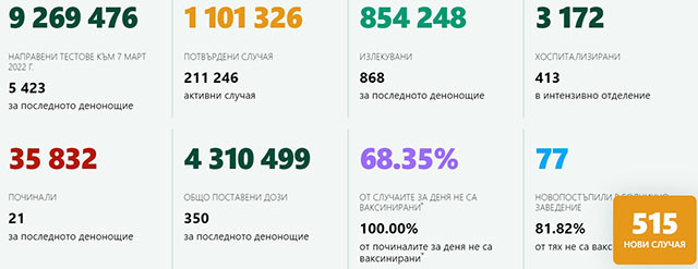 Броят на новозаразените с COVID-19 в неделя е 515 души.