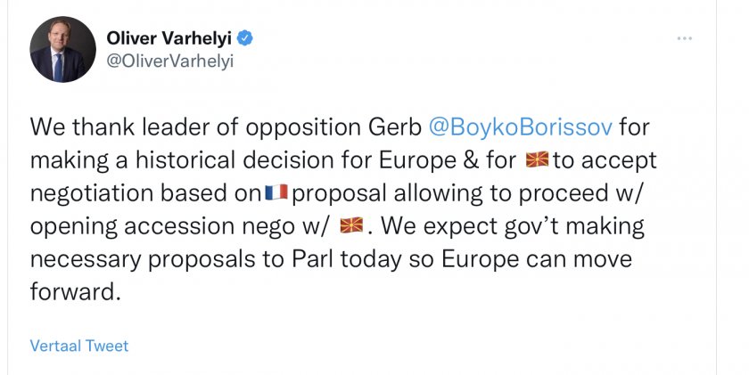По-рано през днешния ден комисарят по разширението Оливер Вархей благодари на Бойко Борисов за това, че взел “историческо решение за Европа и за Северна Македония и е подкрепил френското предложение и започването на договаряния за участие със Северна Македония”.