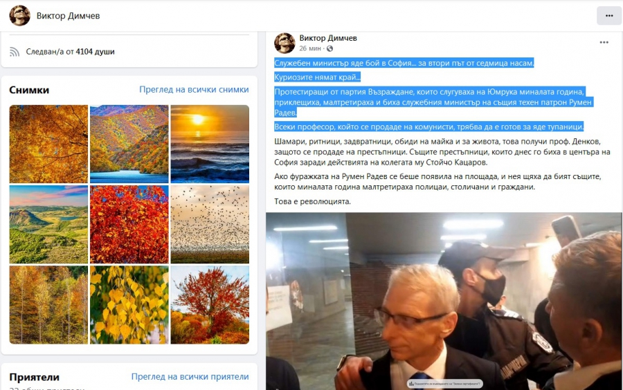 Известният във Facebook като прокарващ позиции в поддръжка на ГЕРБ фотограф и режисьор Виктор Димчев: " Всеки професор, който се продаде на комунисти, би трябвало да е подготвен да яде тупаници ".