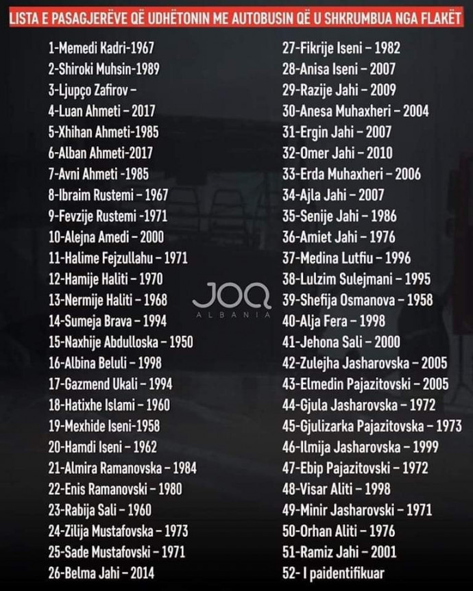 Македонската телевизия Алсат, която предава на албански език разгласява лист на пасажерите, които са били в изгорелия рейс на автомагистрала " Струма ", съобщи ". Повечето починали са с албански генезис.