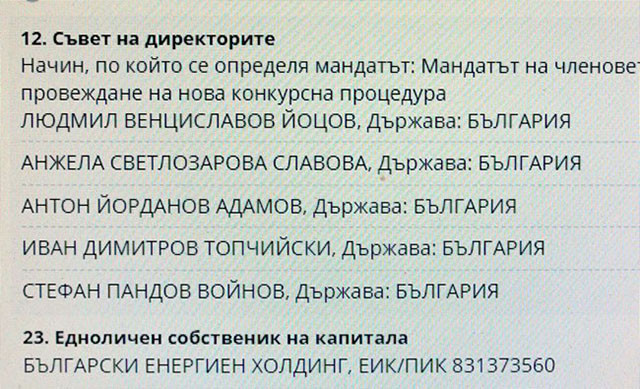 Новите членове на борда към този момент са вписани с дата 3 февруари в Търговския указател. В борда е и Анжела Славова, която допреди няколко седмици бе правист в “Булгаргаз ” и бе освободена от остарелия началник Николай Павлов, откакто 21 година беше в компанията. В управата влизат и ексдепутатът от “Има подобен народ ” Антон Адамов и Стефан Войнов - предприемач, свързван със известията.