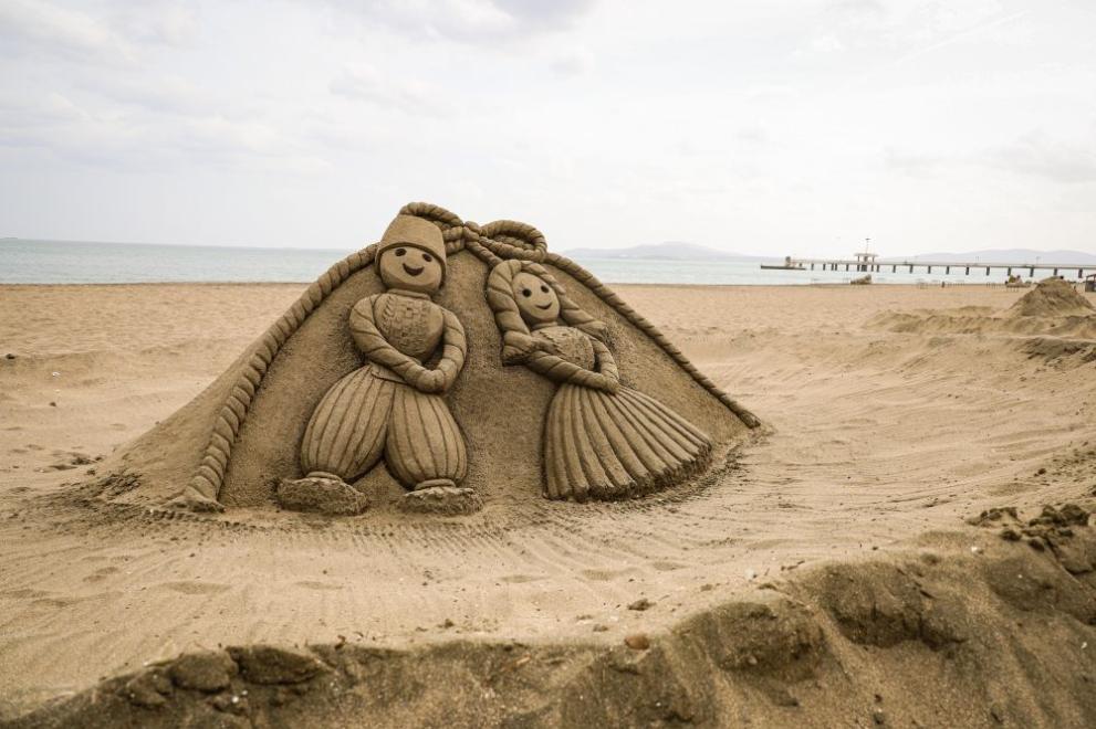 На централния плаж, във връзка празника Баба Марта, се появи пясъчна фигура на Пижо и Пенда.