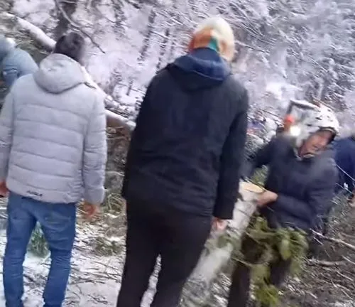Дървета са паднали някъде по пътя Самоков - София, блокирайки придвижването. а водачите, към 7-10 мъже, изпаднали в капан запрятат старания и се включват в битката с ядосаната природа.