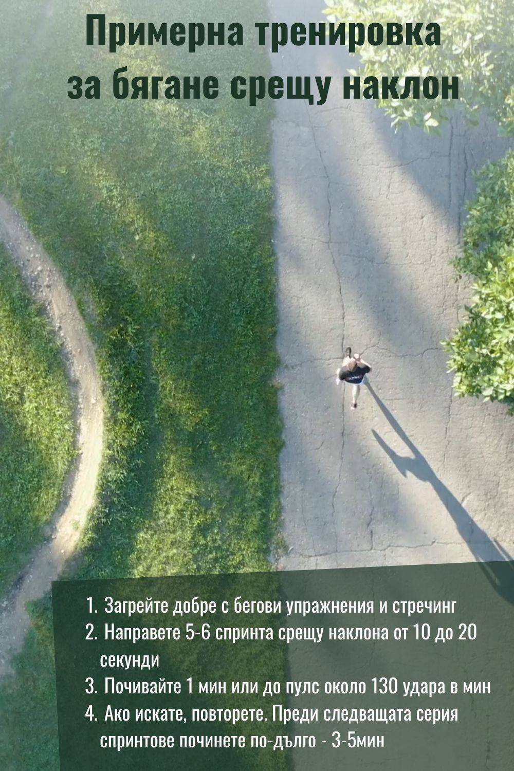 Наклонът ще ви помогне като направи краката ви по-силни, по-здрави и по-устойчиви по отношение на нормалното тичане. Особено потребни са къси прави от 30 до 60 метра, които преодолявате със спринт. Те спомагат укрепване на мускулатурата на краката, както и пълноценното активиране на квадрицепси, седалище, задно бедро и пръсци. Бягането по надолнище ще ви помогнете да стегнете и развиете тази мускулатура, а в случай че са ви омръзнали кръговите или силови тренировки за крайници, можете от време на време да ги разнообразявате с сходни прави.