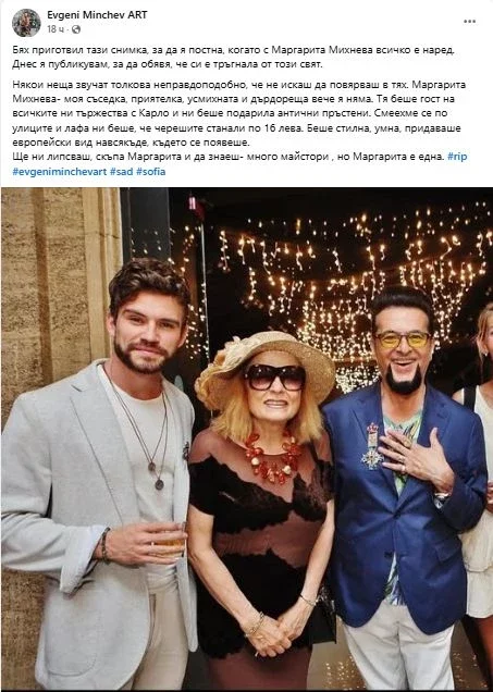 Бях приготвил тази фотография, с цел да я постна, когато с Маргарита Михнева всичко е наред. Днес я обявявам, с цел да разглася, че си е тръгнала от този свят. Това написа в профила си пиар специалистът и всемирски лъв Лорд Евгени Минчев.