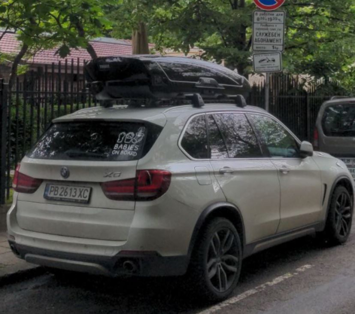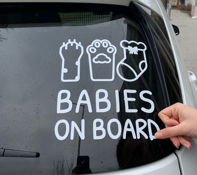 - с изключение на регистрационният номер, на прозореца на багажника има бял стикер с две лапички и бебешко чорапче на който написа Babies on board (няма различен подобен защото сме си го правили ние).