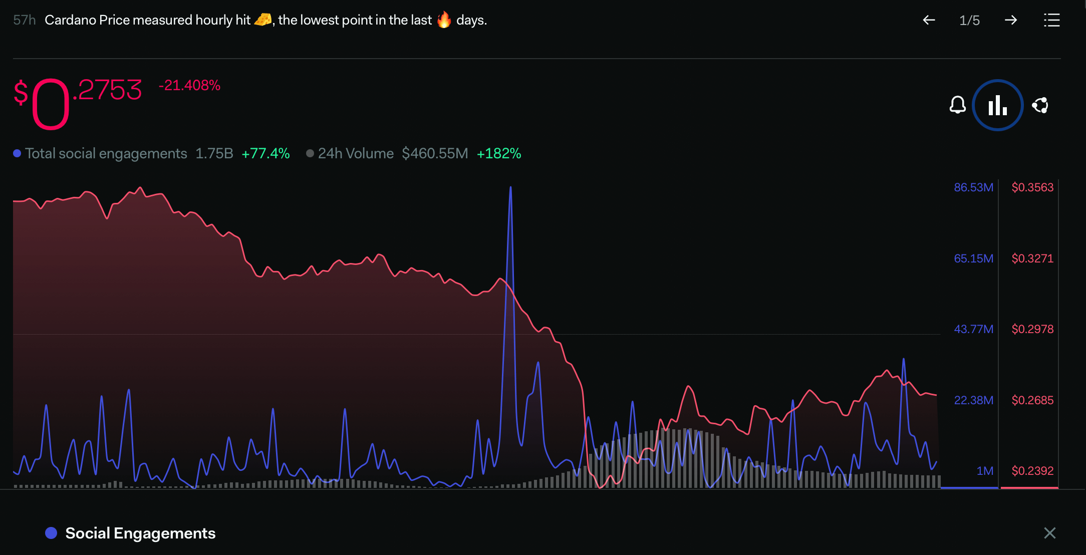По данни на LunarCrush обществените задължения на ADA са се нараснали със 71.4% в границите на вчерашния ден. Този напредък значи, че взаимоотношението на общността в голям брой обществени източници се е подобрило навсякъде.