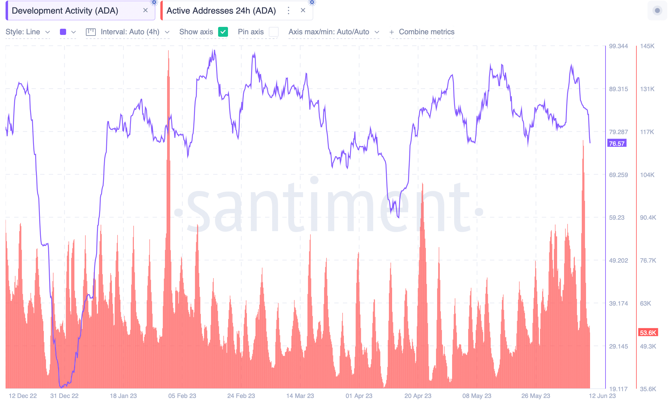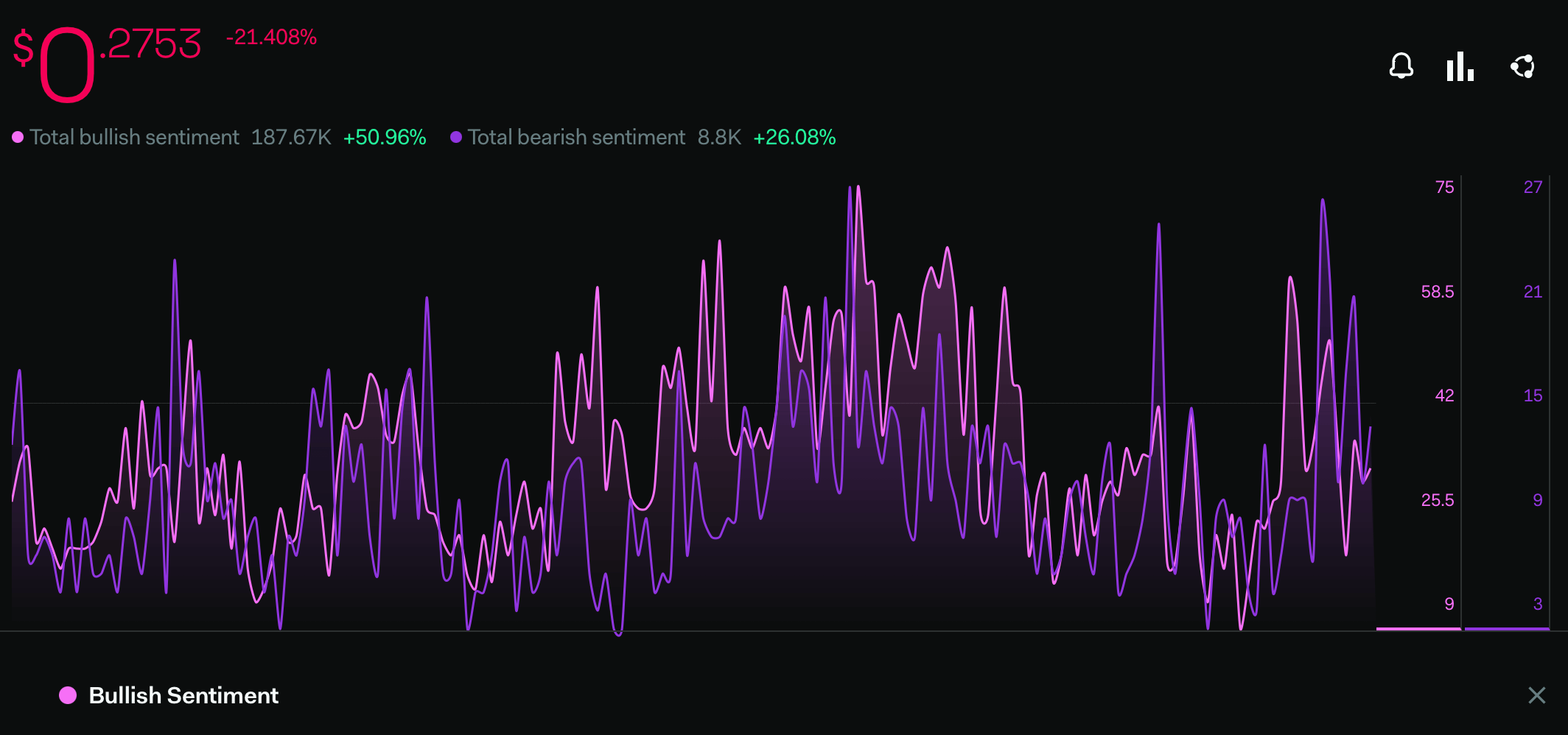 Към момента на правенето на публикацията метриката на бичите настроения се увеличи с 50.9%, до момента в който противоположният ѝ индикатор се беше повишил със 26%. Това значи, че пазарните участници са радостни по отношение на краткосрочното ценово деяние на ADA.