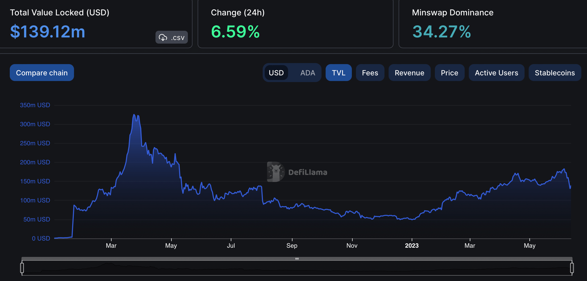 Що се отнася до общата заключена стойност (TVL) на Cardano, положението не се е трансформирало през последните седем дни. Въпреки че планът неотдавна доближи крайъгълен камък в това отношение, той спадна с 14.48% в границите на вчерашния ден.