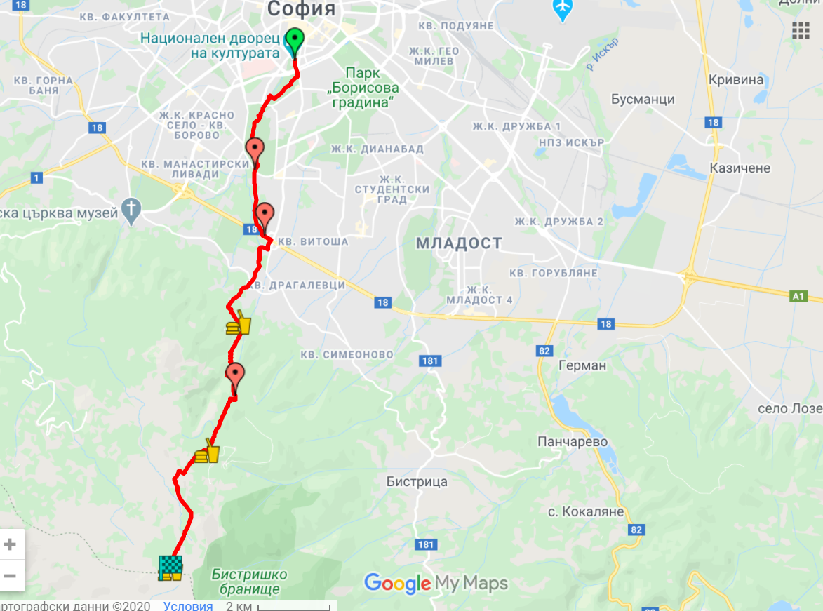 Ето и повече детайлности за трасето: старт в София, НДК (Източната част до билетния център), край на Черни връх; Дължина: 18 км, D+1734 м с 5 междинни контролни пункта (виж схемата на трасето), минава по Моста на влюбените, пo централната алея на Южен парк, продължава по ул. Никола Крушкин, пресича Околовръстен път на кръговото с бул. Черни връх, зад Фантастико, по ул. Чемшир през Драгалевци, Посетителски център Витоша, пътеката за Черни връх, през Голи връх и Платотo до финала. Маркировка с жълт краткотраен спрей и табели.