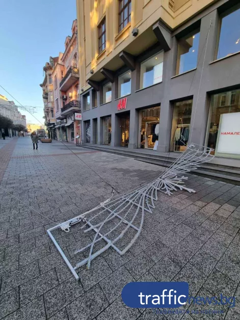 Още през вчерашния ден макар мощния вятър и валежи, служащи демонтираха декоративните детайли от украсата по най-дългата пешеходна зона в Европа, както и разглобяваха елхата пред Община Пловдив. Няма информация за потърпевши хора при рухването на този детайл от празничната украса.