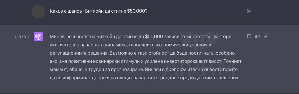 Според ChatGPT, действително има късмет Биткойн да стигне до $50,000, само че точният миг на реализиране на тази стойност е неразбираем. Навярно това може да се случи към халвинга през 2024 година, когато премиите за нови блокове се редуцират на половина и провокират промени.
