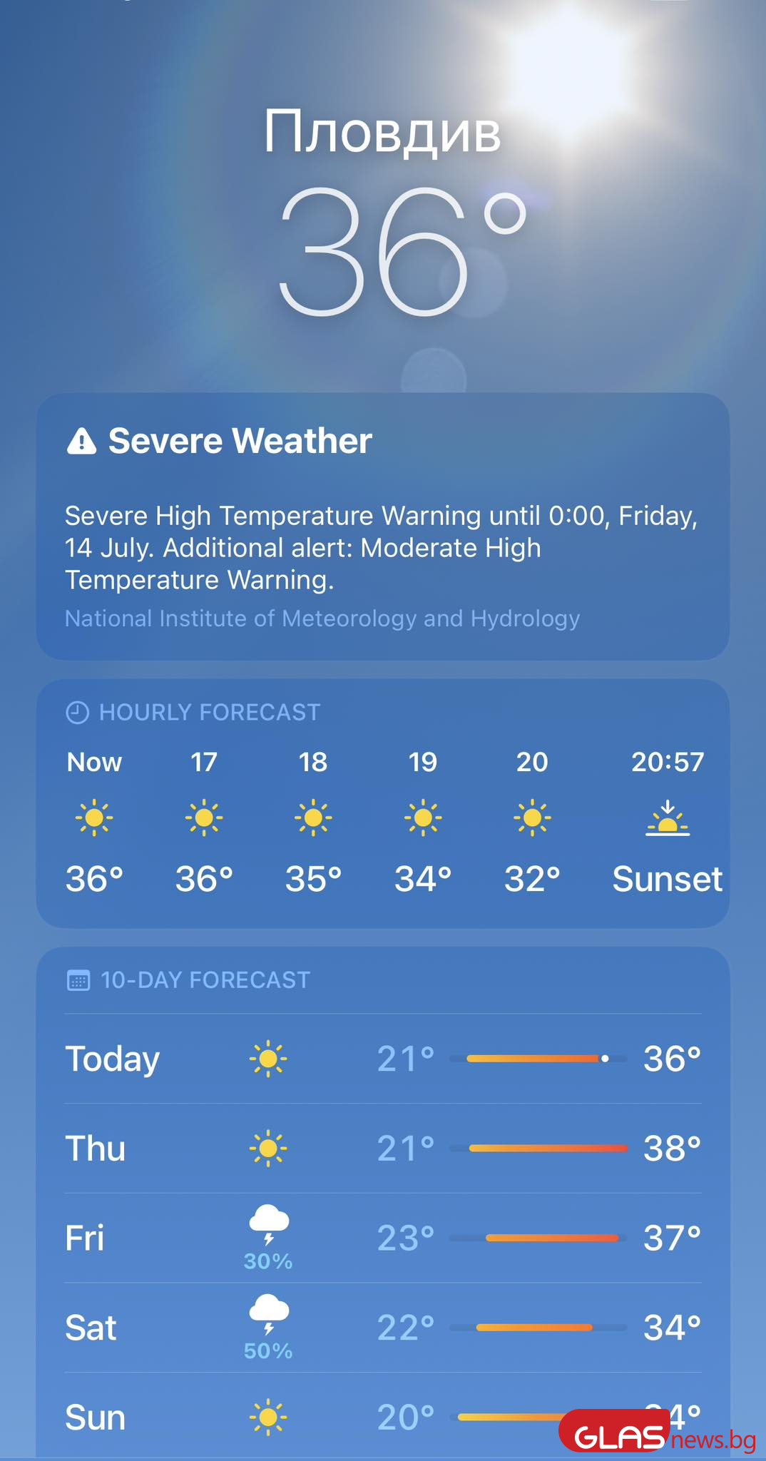 И това не е всичко - опасни горещини се задават в цялата страна и в четвъртък, 13 юли, сочи картата на Национален институт по метеорология и хидрология. Максималните температури ще скочат до 38°-41° тук-там, предизвестяват синоптиците.