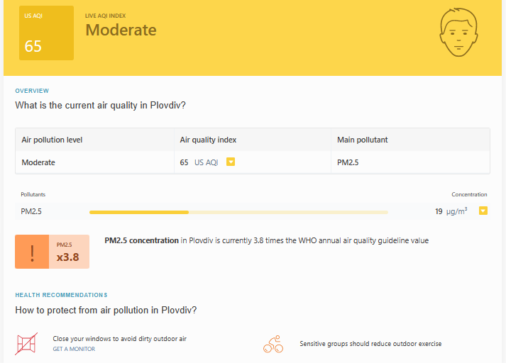Според портала IqAir, ниват на фините прахови частици PM 2.5 са 3 пъти над от нормата. Световната платформа сигнализира, че при сходни равнища хората не би трябвало да спортуват на открито и би трябвало да затварят прозорците си.