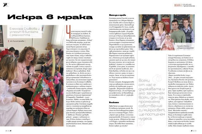 Тази история е по-различна. В нея няма приказност и суетност. Има борба със суровата действителност, има черни стени, мраз и човешки ориси от тези, които стискат за гърлото. За тях избираме да не приказваме, с цел да съхраним себе си. По-често извръщаме взор, чукаме на дърво, сочим с пръст и шептим или крещим “къде е страната ”. После забравяме. Както забравяме, че “всеки от нас е страната и в случай че стартираме всеки ден да променяме личния си микросвят, ще реализираме чудеса. ” Думите са на Елеонора Сливкова. Човек с огромно “Ч ”, би споделил всеки, който се допре до заразното положително. Елеонора раздава смисъл и припомня за продавача на вяра от приказния свят на Джани Родари. Избира пътя сама, даже когато заплашва живота й.