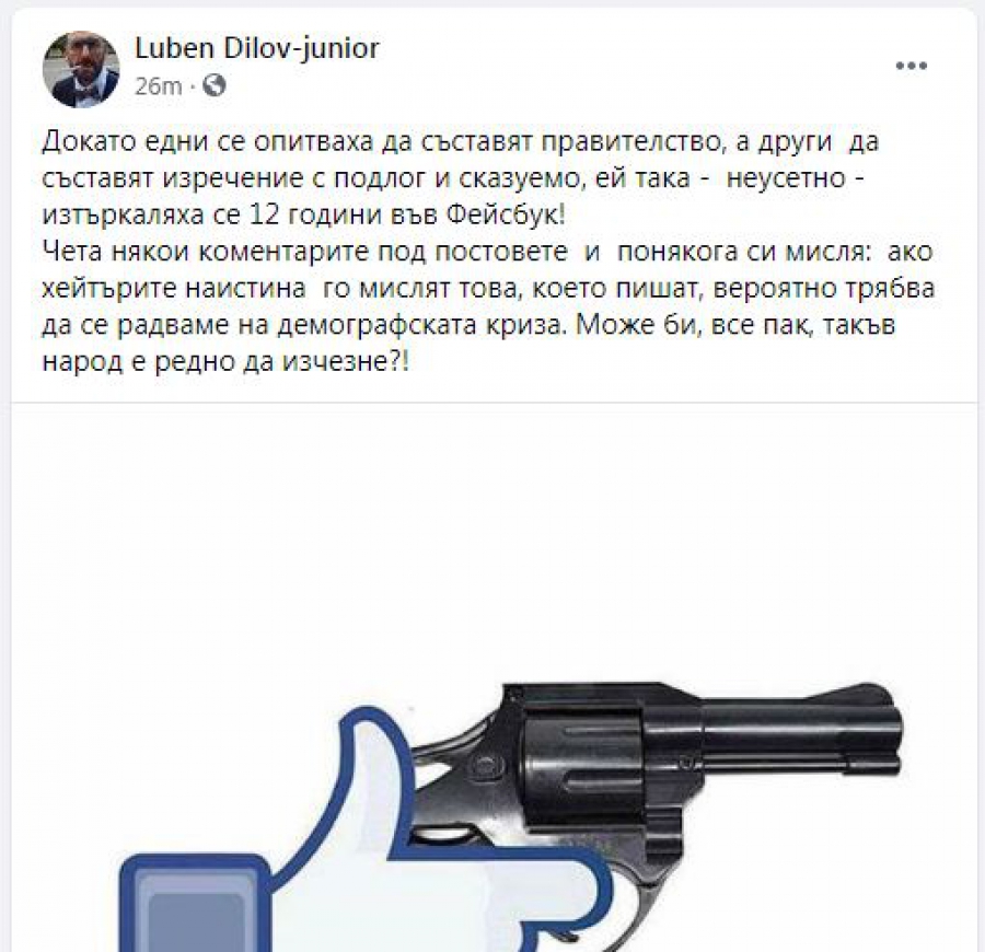 Чета някои мненията под постовете и от време на време си мисля: в случай че злобарите в действителност го мислят това, което пишат, евентуално би трябвало да се радваме на демографската рецесия. Може би, въпреки всичко, подобен народ е редно да изчезне?! Това написа някогашният към този момент народен представител от ГЕРБ Любен Дилов-син на страницата си във Фейсбук.