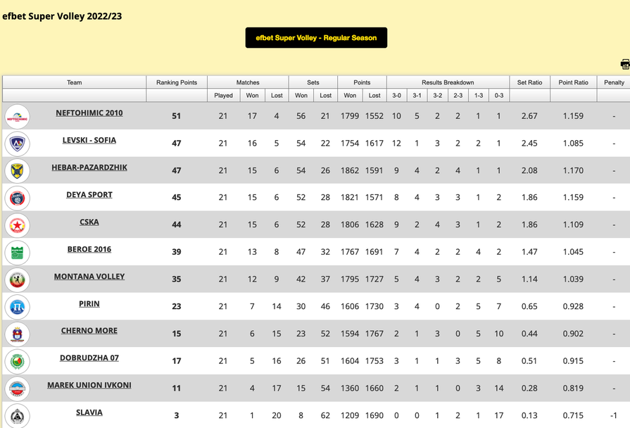 Редовният сезон в Супер Волей излъчи своя отличник в лицето на Нефтохимик, който към този момент е неосъществим на върха на класирането, само че местата от 2-о до 5-о ще се разпределят в последния кръг.