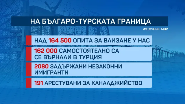 Според формалните данни през последната година над 164 500 души са се пробвали незаконно да пресекат границата с южната ни съседка, само че 162 000 са се върнали назад, откакто са открили съществуването на българските патрули.