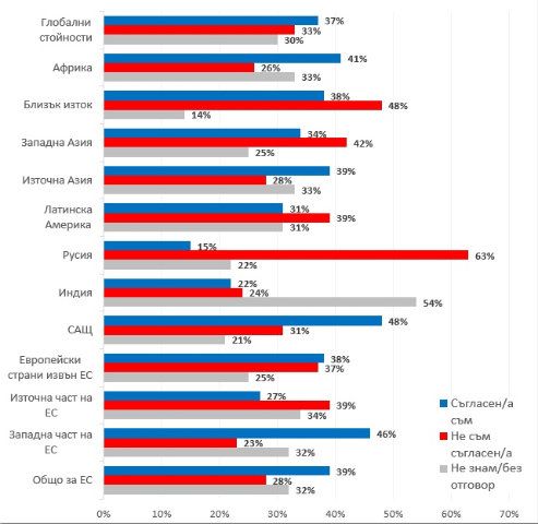 У нас мненията са типични за източноевропейци: съгласни с съществуването на съветска интервенция в американските избори за президент са 16%, на противоположното мнение са 37%, само че и тук българското общество не желае да стига до крайности и 47% от респондентите не изразят своето мнение по тематиката.