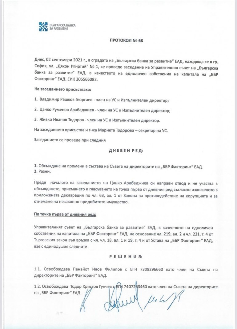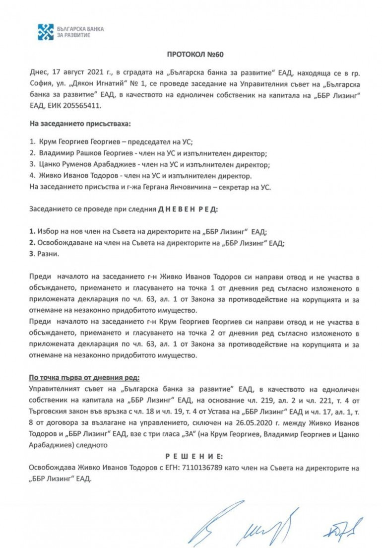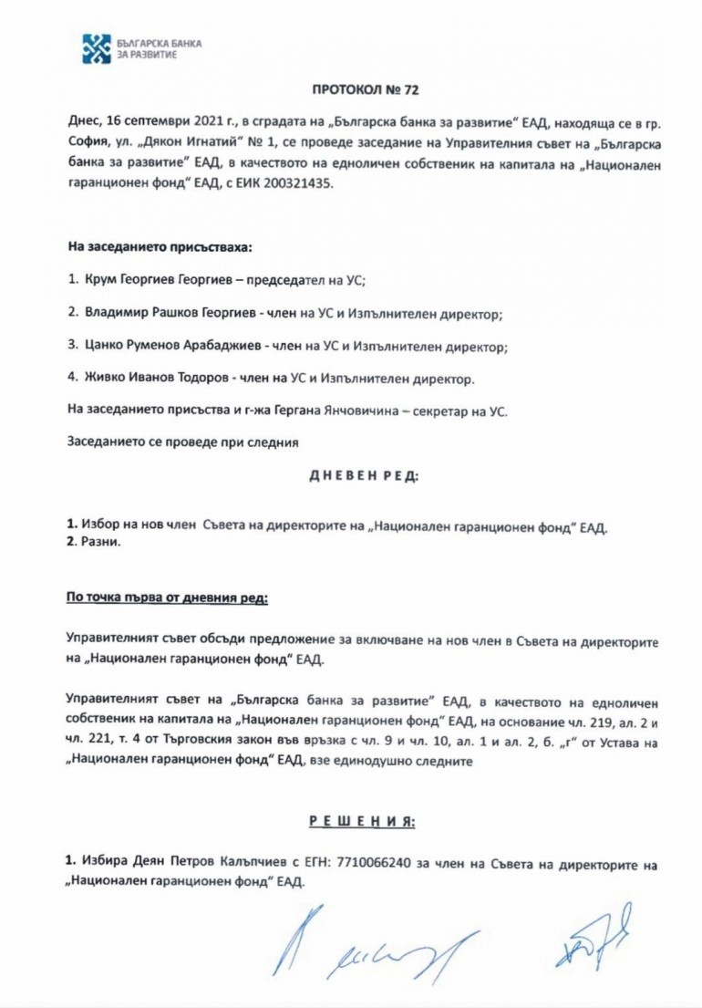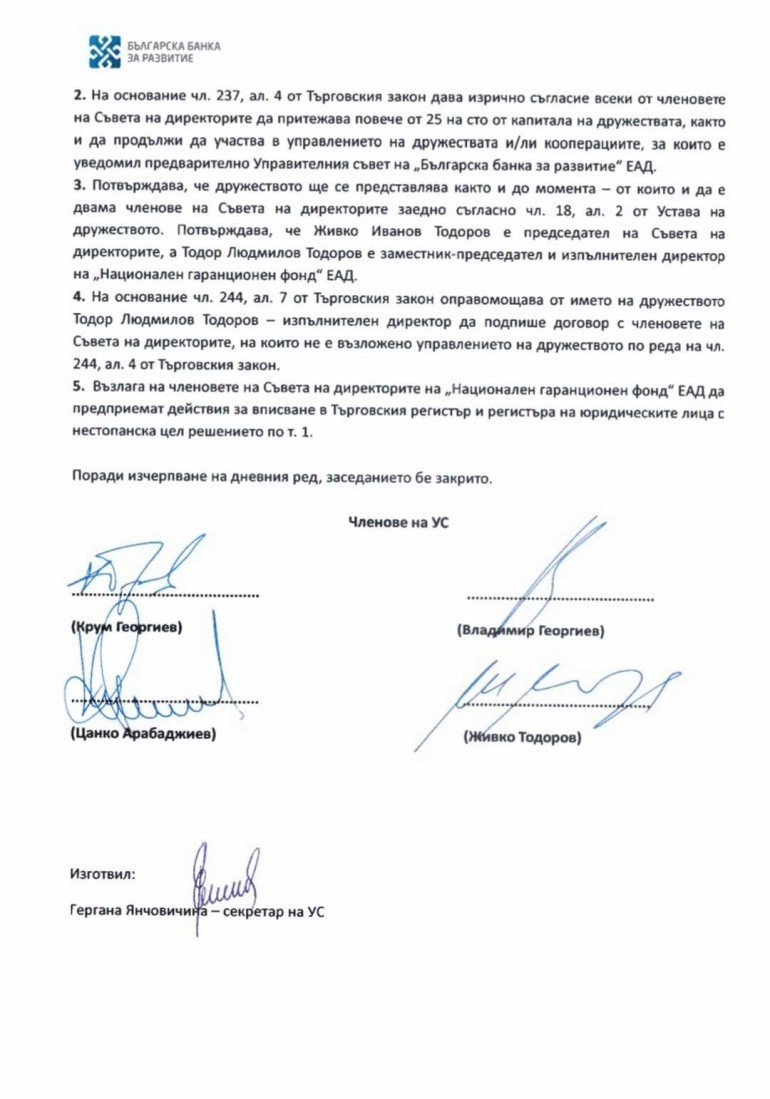 С протокол №72 на Управителния съвет на ББР се удостоверява присъединяване като член съвета на шефовете на Национален гаранционен фонд ЕАД на Живко Иванов Тодоров. Той е член и на Съвета на шефовете и на ББР и персонално се е подписал за потвърждаване на присъединяване си в съвета на шефовете на Национален гаранционен фонд ЕАД, за което получава заплащане.
