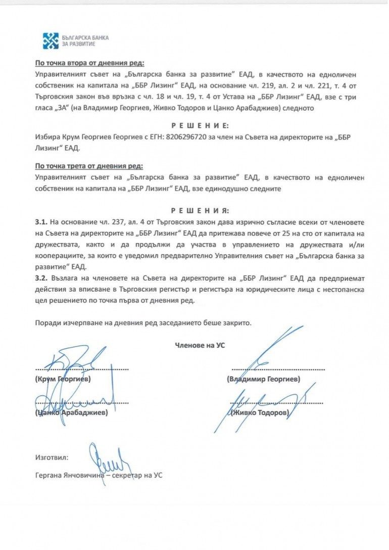 Крум Георгиев персонално се е подписал за назначението си в ББР Лизинг ЕАД, за което получава заплащане.