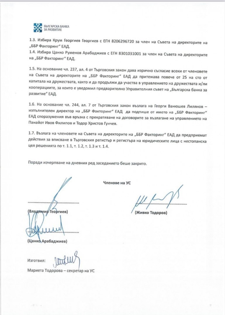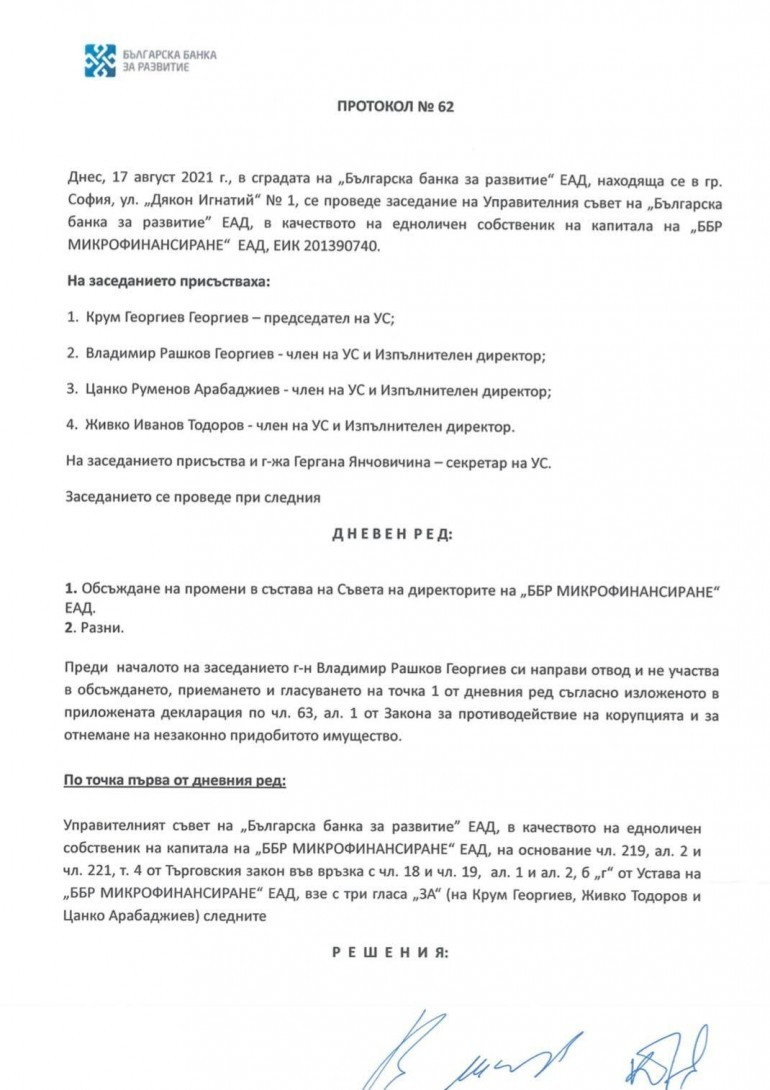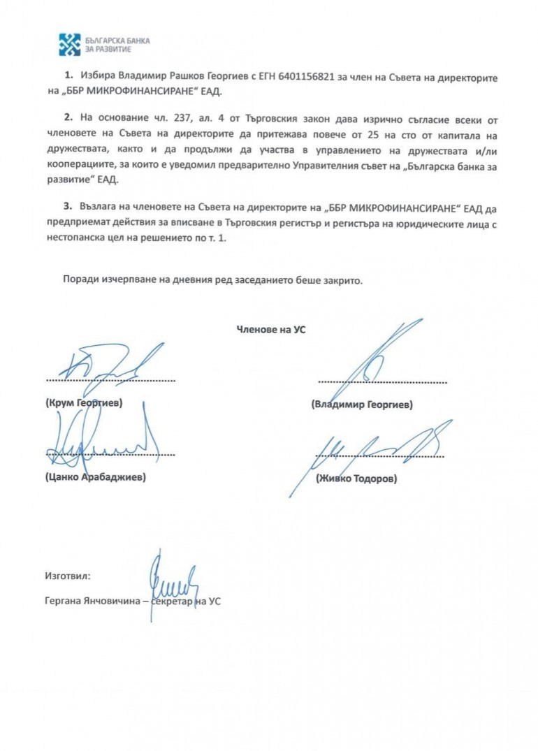 Владимир Георгиев персонално се е подписал за назначението си в ББР Микрофинансиране ЕАД, за което получава заплащане.