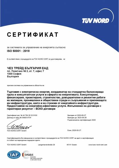 Международният стандарт ISO 50001 разрешава на фирмите да понижават енергийното ползване, да намаляват въглеродния отпечатък и да редуцират разноските за сила посредством поощряване на стабилно потребление на ресурсите. Прилагането му подсигурява, че ЧЕЗ Трейд е ангажирана с правилата за запазване на околната среда, посредством взимане на решения, които са основани на данни за потреблението. Действащата система за ръководство на силата обезпечава по-голяма осведоменост, присъединяване и ангажираност на чиновниците с правилата на енергийната успеваемост. Сертификатът подсигурява дейно и транспарантно ръководство на ресурсите.