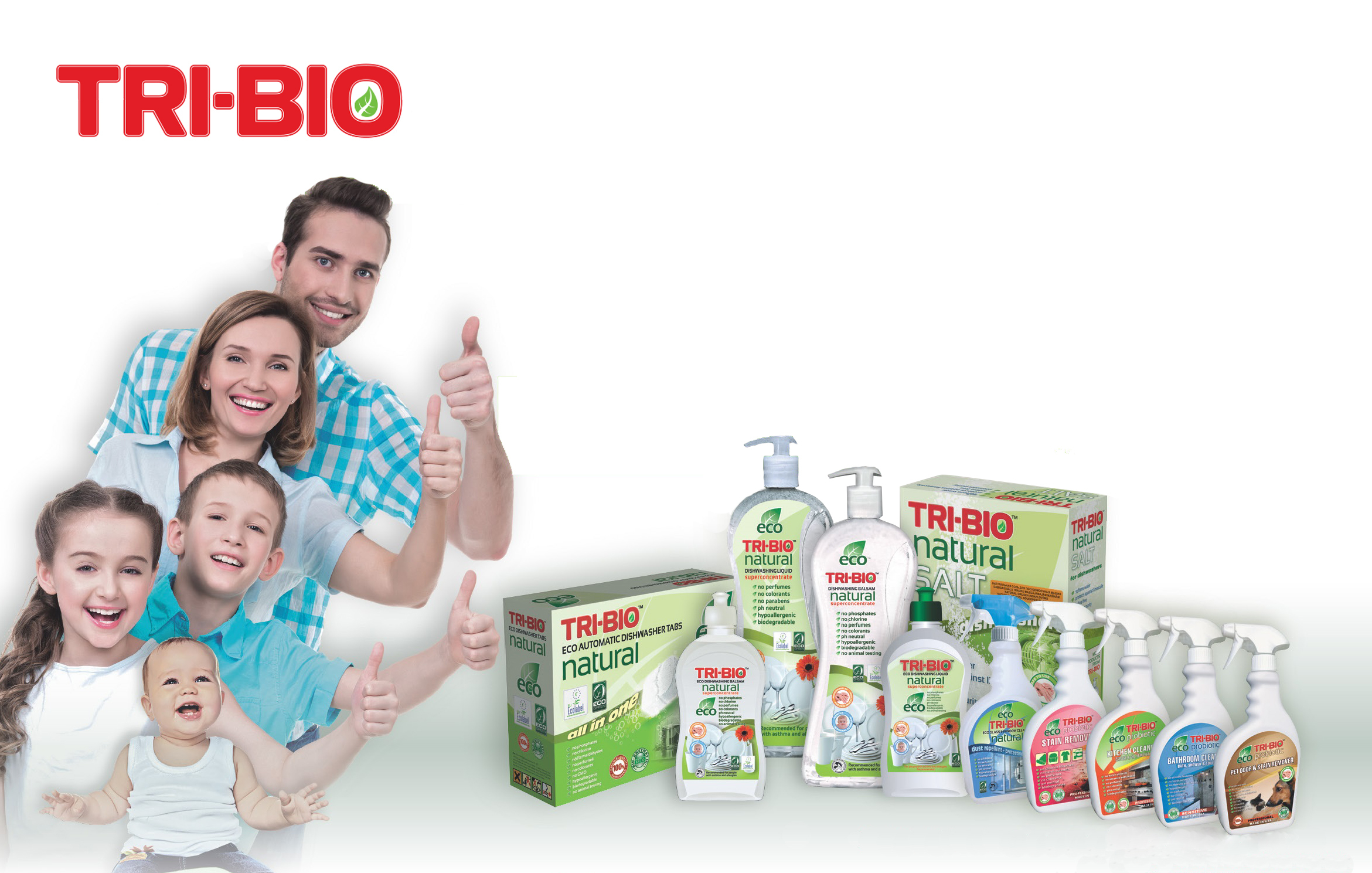 Пробиотичните екологични почистващи препарати TRI-BIO дават опция за решение на най-важните задания за домашна грижа, дейно разчистване, обезмасляване, стерилизация на всевъзможни повърхности и са с продължен резултат, като ги поддържат микробиологично чисти до седем дни.