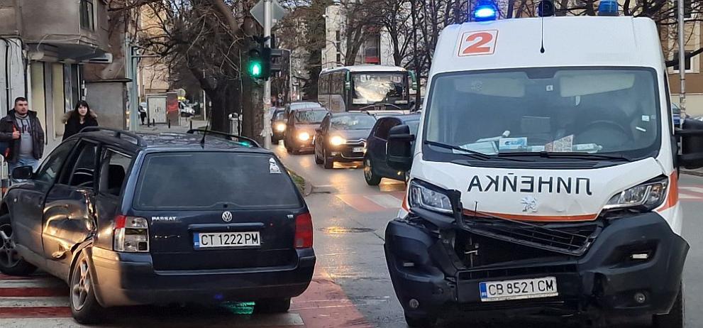 Линейката , транспортирала пациент в тежко положения с включена звукова и светлинна сигнализация, минала на червен светофар. Единият от колите, обаче, не я изчакал и се сблъскали. В тях се блъснала и друга кола.